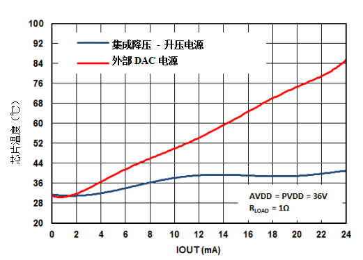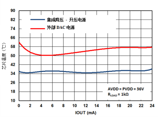 DAC8775的效率也導致需要更多的熱優(yōu)化系統(tǒng)。在具有和不具有自適應功率反饋電路的四通道設計中比較芯片的結溫顯示了芯片溫度的顯著改善。圖3和圖4所示為DAC8775的測量結果,比較了在1Ω和1kΩ RLOAD情況下,使用和不使用降壓/升壓轉換器的模溫。從圖3可以看出,這種技術可以將結溫提高至高達36°C。