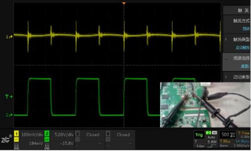 測試方法:通道1測量小信號(100mv/div),通道2測量大信號(5V/div),觀察信號互相影響的情況。