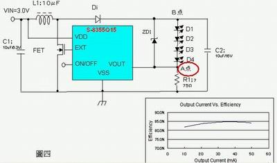 圖3所示的電路是白光LED用電源。由于白光LED是電流控制,因此需要穩定的電流。此電路中,流過LED的是穩定電流。為控制各LED亮度偏差,LED采用串聯的方式排列。DC/DC變換器采用了S-8356Q15 VDD端子與VOUT端子分離型,輸出電壓為1.5V。