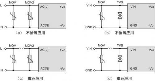 電源模塊體積小,在EMC要求比較高的場合,需要增加額外的浪涌防護(hù)電路,以提升系統(tǒng)EMC性能。如圖1所示,為提高輸入級(jí)的浪涌防護(hù)能力,在外圍增加了壓敏電阻和TVS管。但圖中的電路(a)、(b)原目的是想實(shí)現(xiàn)兩級(jí)防護(hù),但可能適得其反。如果(a)中MOV2的壓敏電壓和通流能力比MOV1低,在強(qiáng)干擾場合,MOV2可能無法承受浪涌沖擊而提前損壞,導(dǎo)致整個(gè)系統(tǒng)癱瘓。同樣的,電路(b),由于TVS響應(yīng)速度比MOV快,往往是MOV未起作用,而TVS過早損壞。