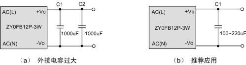 如圖2中的電路(a)所示,一個(gè)3W的模塊,輸出使用了2000uF的電容,而通過查閱產(chǎn)品手冊(cè)了解到,模塊建議最大輸出電容為800uF。輸出電容過大可能導(dǎo)致啟動(dòng)不良,而對(duì)于不帶短路保護(hù)的微功率DC-DC模塊,輸出電容過大甚至可能導(dǎo)致模塊永久損壞。