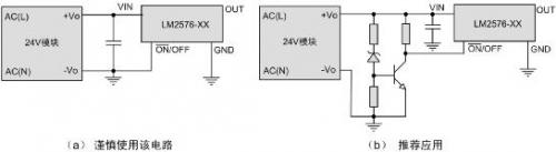 因此推薦使用電路(b),外置簡單的欠壓鎖定,使24V模塊輸出電壓建立到預(yù)置值后再啟動(dòng)LM2576等外接開關(guān)電源芯片,可以很大程度上避免啟動(dòng)不良問題。
