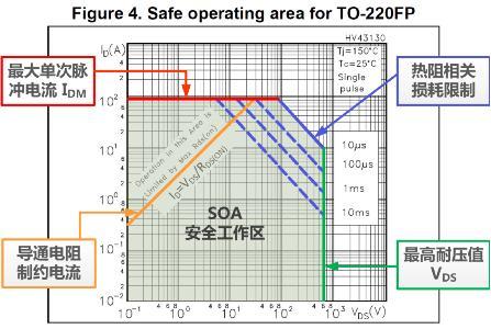 安全工作區(qū):SOA(Safe operating area)是由一系列(電壓,電流)坐標(biāo)點(diǎn)形成的一個(gè)二維區(qū)域,開(kāi)關(guān)器件正常工作時(shí)的電壓和電流都不會(huì)超過(guò)該區(qū)域。簡(jiǎn)單的講,只要器件工作在SOA區(qū)域內(nèi)就是安全的,超過(guò)這個(gè)區(qū)域就存在危險(xiǎn)。
