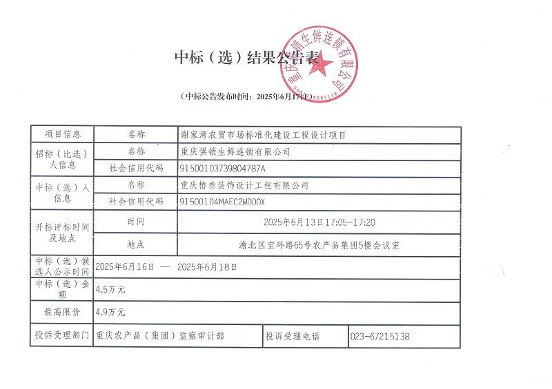 謝家灣農貿市場室內裝飾工程招標比選公告1. 招標比選條件重慶供銷生鮮連鎖有限公司謝家灣農貿市場室內裝飾工程,招標人為重慶供銷生鮮連鎖有限公司,資金來自業主自籌資金,...