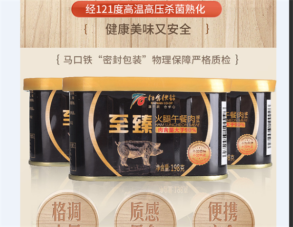重慶市農產品集團食品科技有限公司生產的“佰年供銷”罐頭,包括午餐肉系列罐頭、紅燒豬肉罐頭、紅燒扣肉罐頭、紅燒牛肉、清蒸豬肉罐頭、豬肉雜醬和牛肉雜醬系列罐頭等20多個品種近50種規格。傳承古法罐裝優勢,結合現有高科技設備,采用優質原材料、馬口鐵容器,經歷金屬探測、人工挑選、真空斬拌及拌合、定量裝罐、抽真空封口、121℃以上高溫殺菌、X光機檢驗等多層工藝,基本不主動添加防腐劑,向廣大客戶提供肉味濃郁、開罐即食、保質期長的便利肉罐頭,是家用餐、旅行餐、野外餐必備良品。
